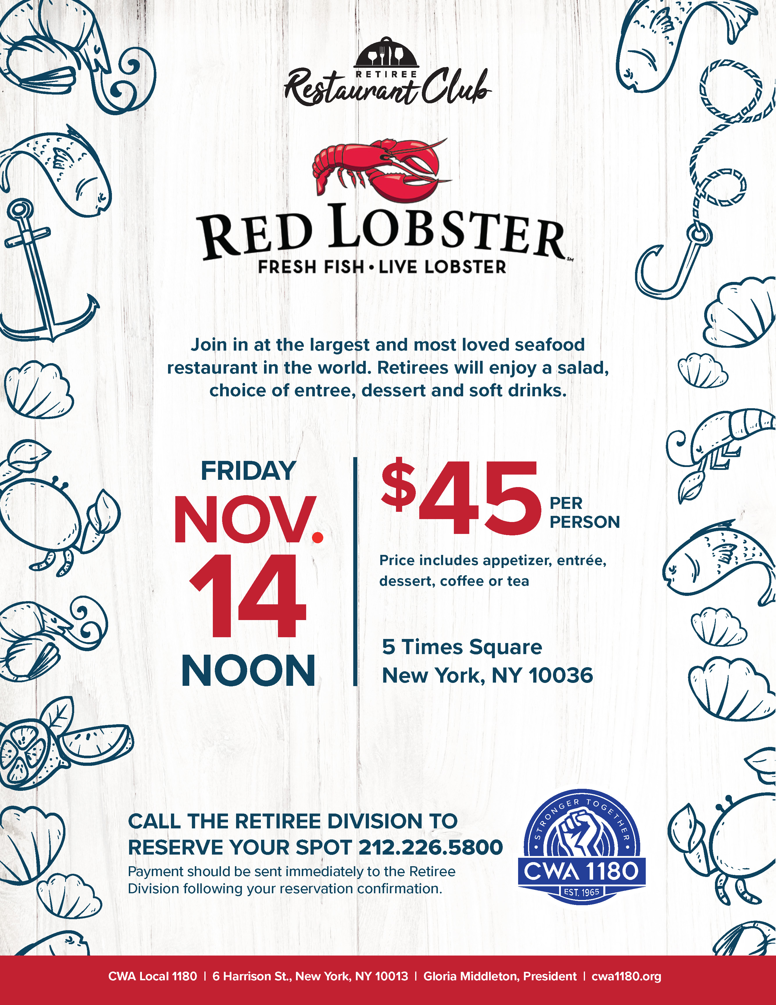 Fri. 11/14  | Restaurant Club at Red Lobster  Join in at the largest and most loved seafood restaurant in the world. Enjoy a salad, choice of entree, dessert and soft drinks. $45/person  | Red Lobster  Call the Retiree Division to reserve your spot today: 212.226.5800  |