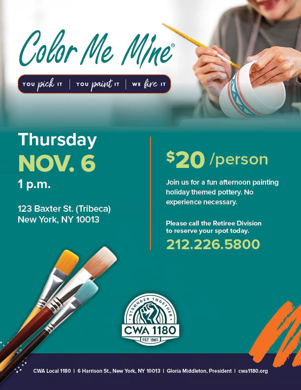 Thurs. 11/6  | Color Me Mine  Join us for a fun afternoon painting holiday themed pottery. No experience necessary. $20/person  | Color Me Mine  Call the Retiree Division to reserve your spot today: 212.226.5800  |