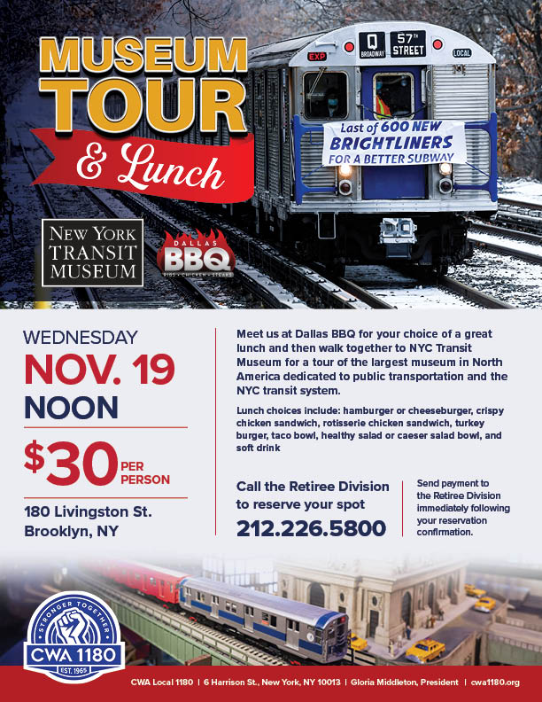 Meet us at Dallas BBQ for your choice of a great lunch and then walk together to NYC Transit Museum for a tour. $30/person  | Dallas BBQ Call the Retiree Division to reserve your spot today: 212.226.5800  | |