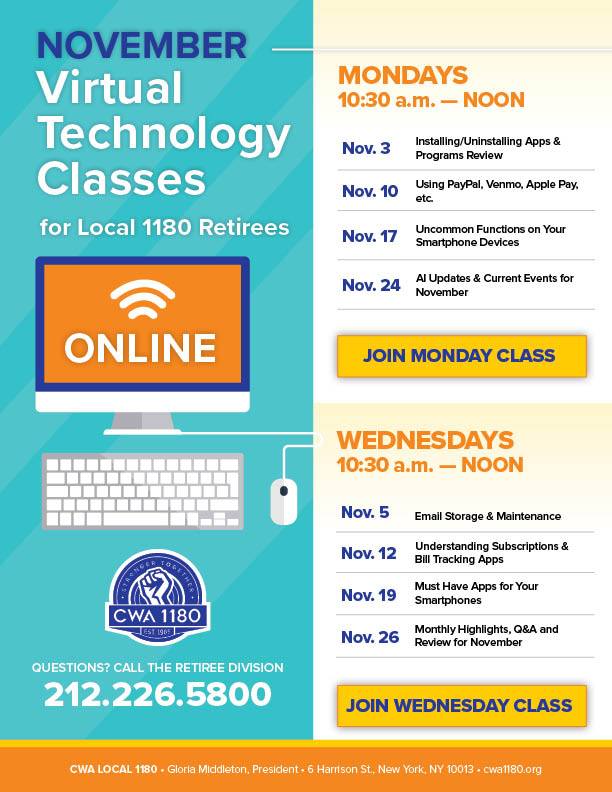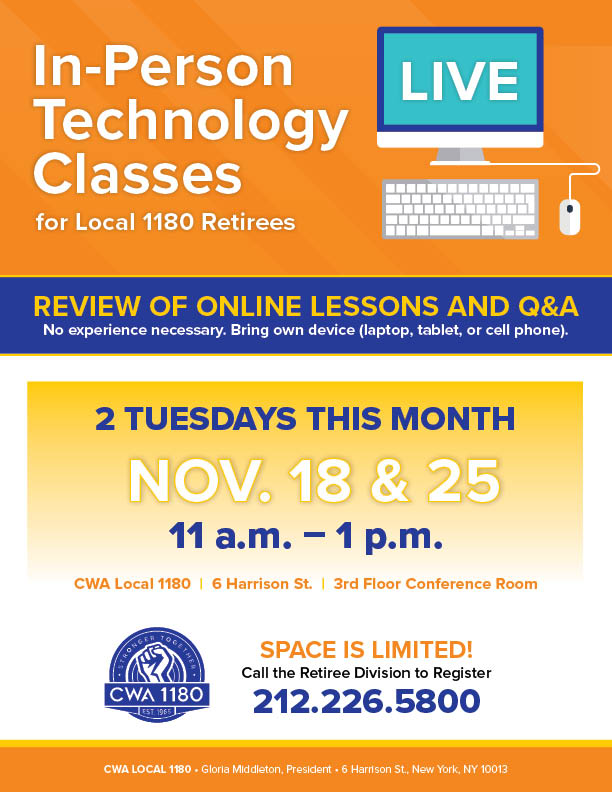 | Tues. 11/18 |  IN-PERSON  Review of Online Lessons / Q&A  | 6 Harrison St. Call the Retiree Division to reserve your spot today: 212.226.5800  |