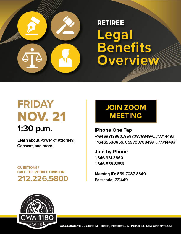 Fri. 11/21  | Legal Benefits Overview Learn about Power of Attorney, Consent, and more.  | Join from PC, Mac, iOS or Android: bit.ly/1180LegalNov iPhone One Tap Join by Phone  |